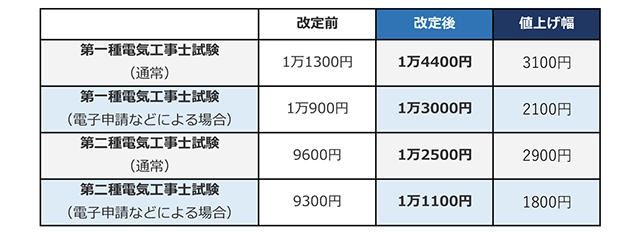 経済産業省は11月11日、「電気工事士法施行令」を改正し、第一種電気工事士試験および第二種電気工事士試験の受験手数料を引き上げると発表した。第一種電気工事士試験は1万4400円(電子申請は1万3000円)、第二種電気工事士試験は1万2500円(同1万1100円)となる。11月14日から適用する。