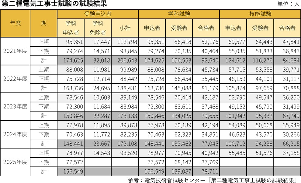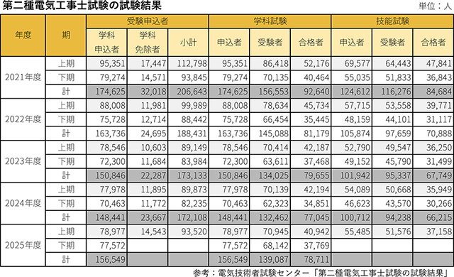 電気工事士試験は、電気技術者試験センターが経済産業大臣の指定を受けて実施している。2024年度の受験者は、第一種では学科試験が3万5320人、技能試験が2万8372人、合格者はそれぞれ2万30人、1万7004人。第二種の受験者は学科試験が13万2462人、技能試験が9万4238人で、合格者はそれぞれ7万7045人、6万6215人となっている。