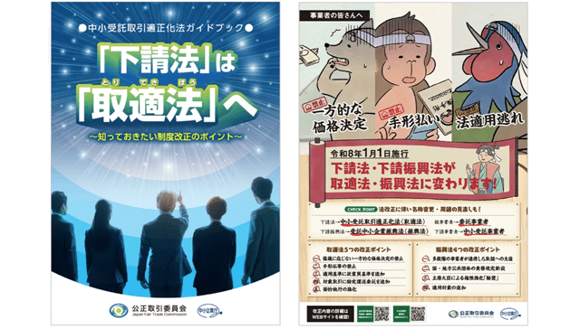さらに詳しい改正内容については、同サイトの巻末に掲載のガイドブック『「下請法」は「取適法」へ』(PDF)で確認できる。