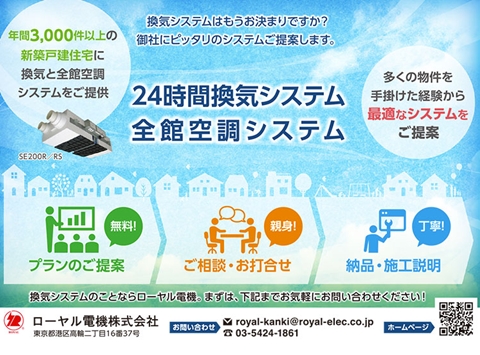 年間3000件以上の新築住宅に換気と全館空調システムを提供しているローヤル電機(東京都港区)は、その豊富な実績から、全国の工務店に最適な換気・全館空調システムの提案を行っている。プラン提案から相談・打ち合わせ、施工説明まで親身で丁寧な対応が同社の強みだ。