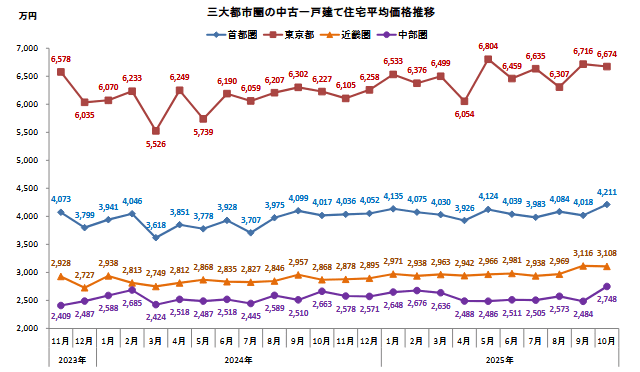 近畿圏は、前月比0.3%減の3108万円と3カ月ぶりに下落。大阪府は3445万円(6.9%増)と築古化したものの上昇した。前年同月比は、2024年10月が2000万円台だったことから15.1%増となった。兵庫県は2934万円(3.8%減)と3カ月ぶりに下落。京都府は4410万円(4.9%減)と下落した。都市別では、大阪市(1.6%増)が5カ月ぶりに上昇。京都市(8.6%減)は下落に転じたが、4カ月連続で6000万円台を維持している。