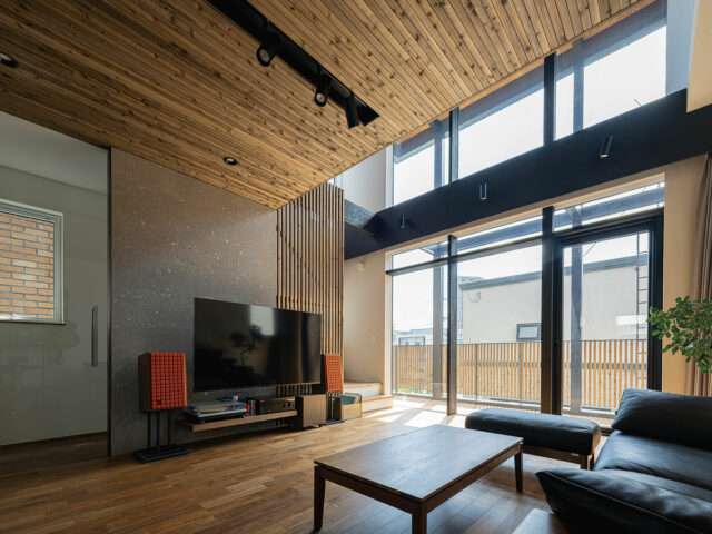 2階リビングの全景。テレビを設置した壁に300×600㎜の札幌軟石を突き付けで張っている。左右の割付けは壁の中心から、天地は壁の下端から行っている。なお札幌軟石の納期は3週間〜1カ月