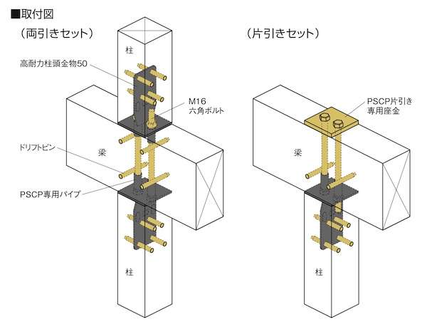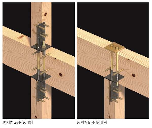 両引き・片引きの2タイプ、それぞれで105用・120用をラインアップ。両引きセットは下階柱頭と上階柱脚を両引きで緊結可能で、梁成150~450mmに対応している。