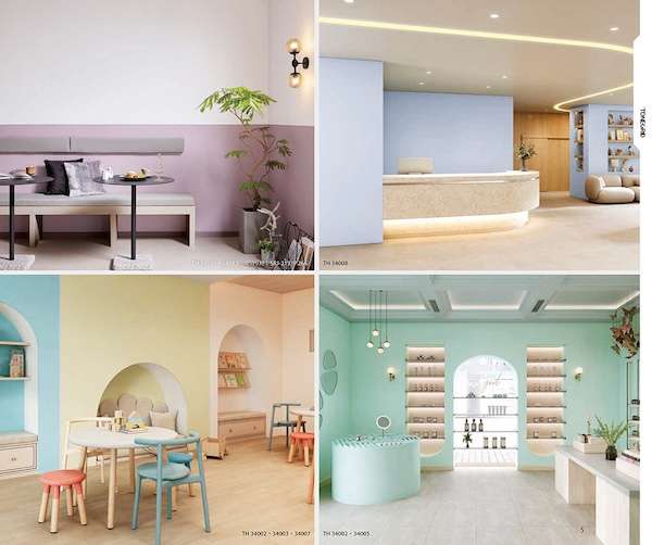 「TONEGRID(トーングリッド)」は、⾊相環に基づく多配⾊コレクションで、さまざまなカラーニーズに対応。すべてのカラーが⽇本塗料⼯業会またはDICの塗装標準⾊に近似しており、内装材から建具、家具まで素材を横断した統⼀感のある空間が可能になる。