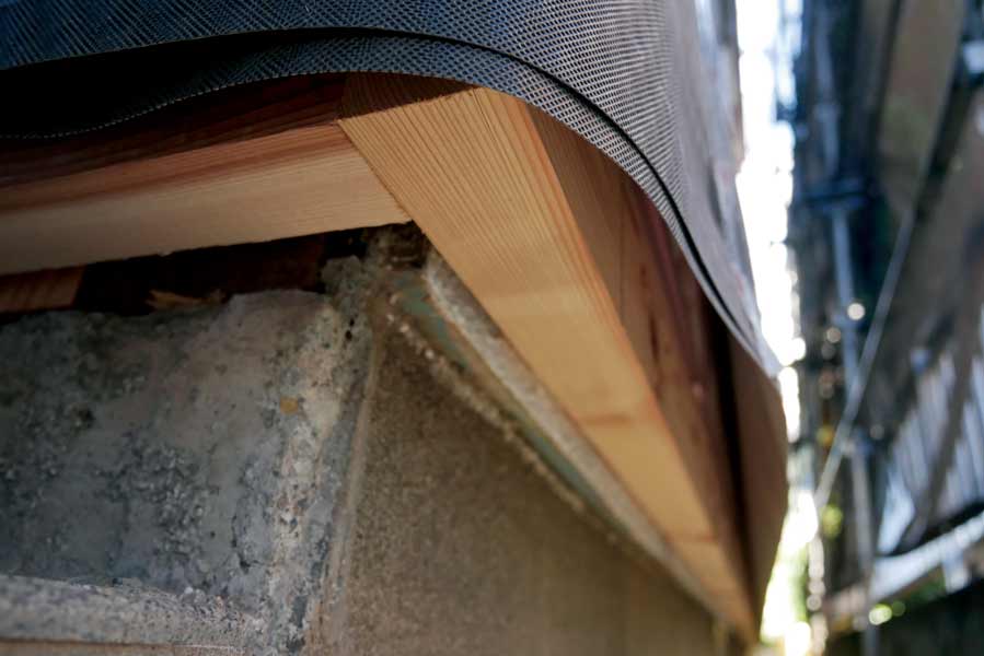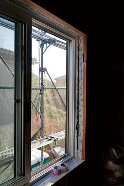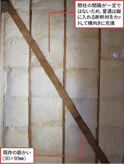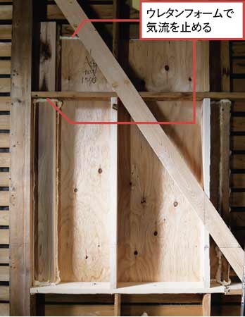 「昔の住宅は不要なところにも窓がついている」ので、暗く眺望も悪い北面の窓を合板でふさいだ。防火規制がかかるエリア(22条地域)なら外側にモルタルなどを塗って防火構造にするが、今回は予算の厳しさもあり、外壁側はモルタルと同じ厚さの胴縁を打って付加断熱材を張った。つなぎ目には気流止めとしてウレタンフォームを吹き、空気の流れを止める。