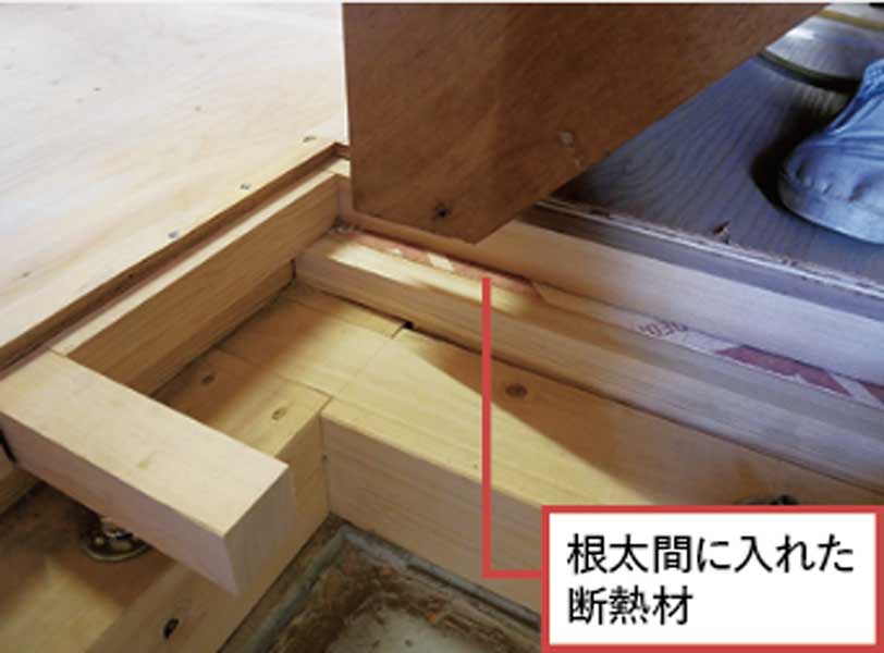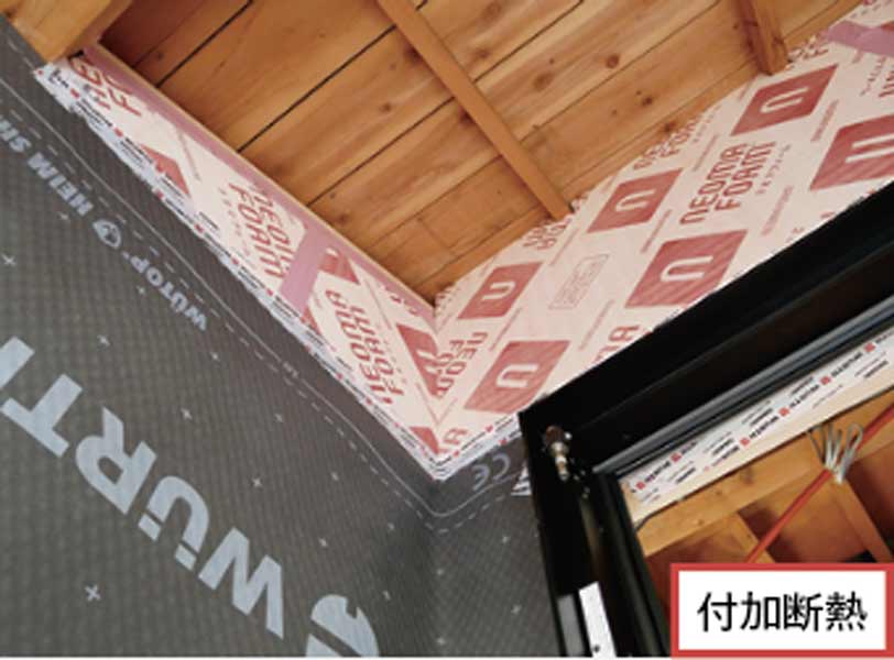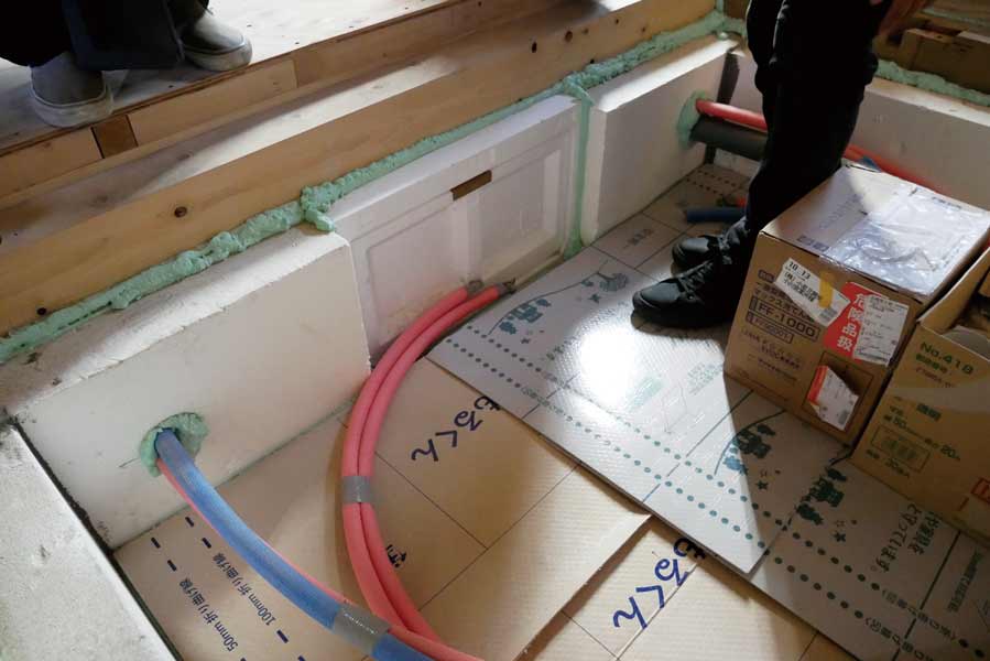 足元は浴室を除いて床断熱で、根太間にネオマフォーム45㎜厚、さらに根太の下にも同45㎜厚を施工。「根太が熱橋になるので、必ず根太の上か下を断熱材で覆う」。上部は天井断熱で、グラスウール22Kを400㎜吹き込む。