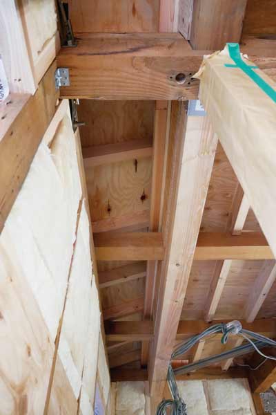 | 付加断熱の下に既存のモルタル外壁が見える。サイディングの場合は重いため必ず剥がす | 1階の増築部。新たにかけた梁を支える柱を増設 |