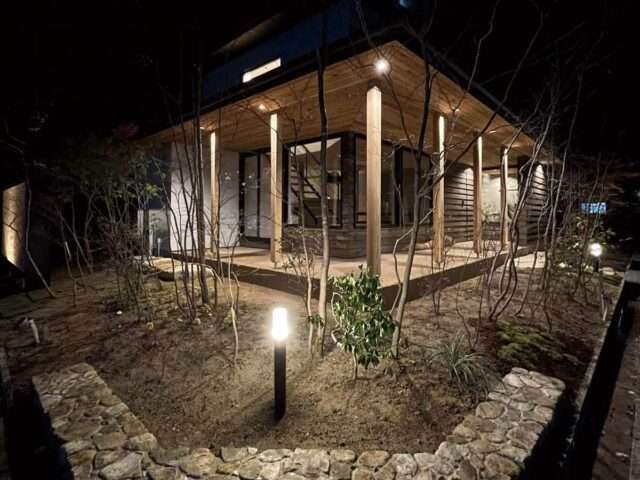 軒下の照明は柱の連続性の強調と室内側に光が入らないようにするために柱よりも屋外側に配置
