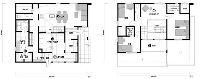 同モデルでは、現代の生活に求められる縁側や土間など伝統空間の役割を「静」と「動」としてとらえ再構築。静の領域の「空縁」は、外からの視線を遮りつつ空に開く設計で、半階上がったスキップフロアから光と風を取り込む現代の縁側とした。動の領域の「ミラクル大収納」「通り土間」 は、車から荷物を運び込める収納性と、玄関からランドリーへの短い動線を両立。合理性と柔軟性を併せ持ち、地域に開かれた交流空間としても機能する。