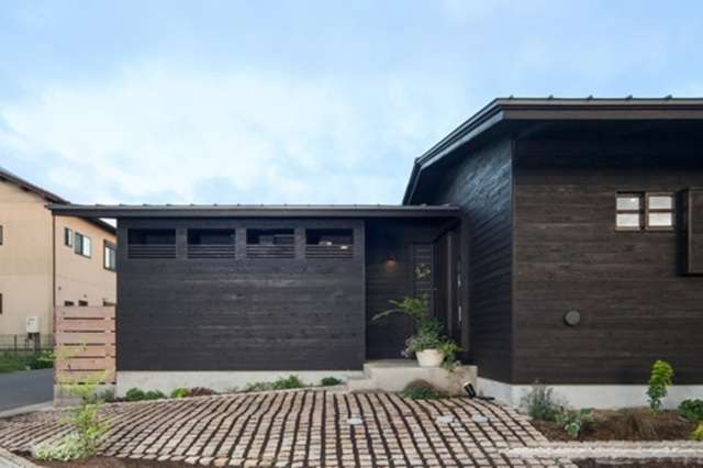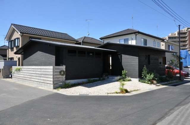 また下の住まいは角地に建っていますが、交差点に面した部分にカーポートを兼ねた広い前庭を設けています。この前庭は街角と住まいとの間にとても心地よい「間(ま)」を作り出してくれています。地面のデザインも見事ですね!