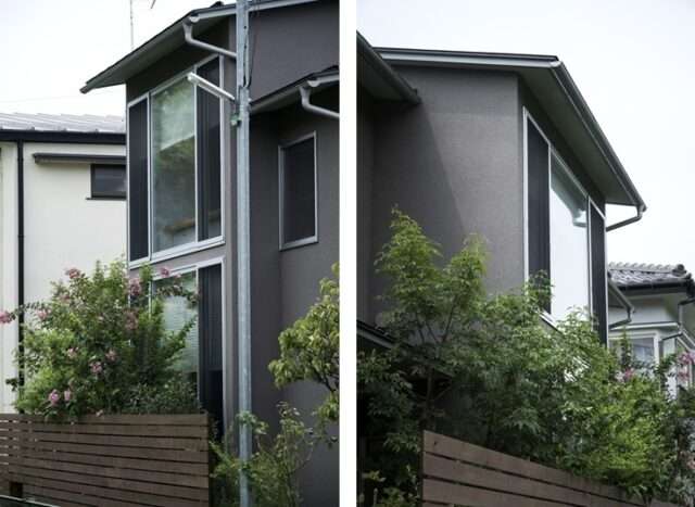 窓が少し奥まり、さらに格子がついているため、外から室内の様子はほとんど見えません。この小さなバルコニーと格子もまた大変優れたバッファーと言えます。さらに1階の玄関を境界線から奥まらせているのも、角の突出感を軽減する優れたデザインです。