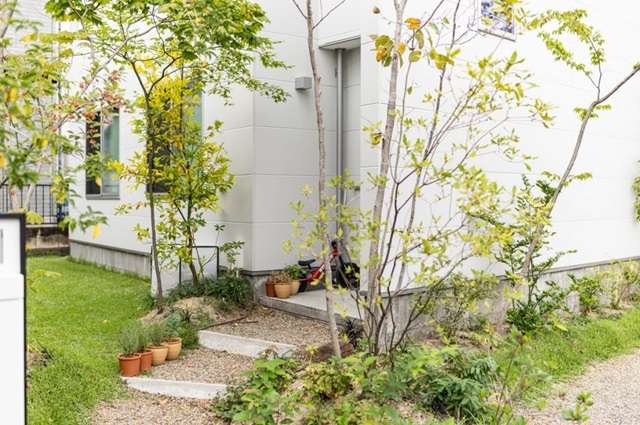 下の住まいは道路側にフェンス類をまったく設けず、植栽を効果的に設けることで道路から住まいへの距離感を見事に演出しています。駐車スペースをも一体とした大変魅力的な外の場所です。