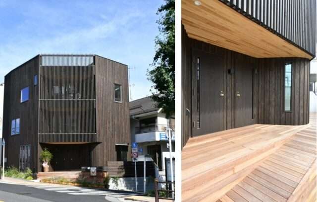 また下の住まいは角地に建っていますが、交差点からの冬の日差しと街角の景色は大変魅力的なものです。そこで2階と3階に大きな窓を設け、さらにその外に小さなバルコニーと格子を設けています。