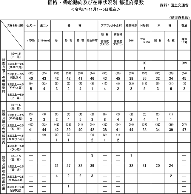 国土交通省が11月25日に発表した「主要建設資材需給・価格動向調査結果」(11月1~5日調査実施)によると、価格動向はすべての資材が「横ばい」に推移した。需給動向はすべての資材で「均衡」、在庫状況はすべての資材で「普通」となった。