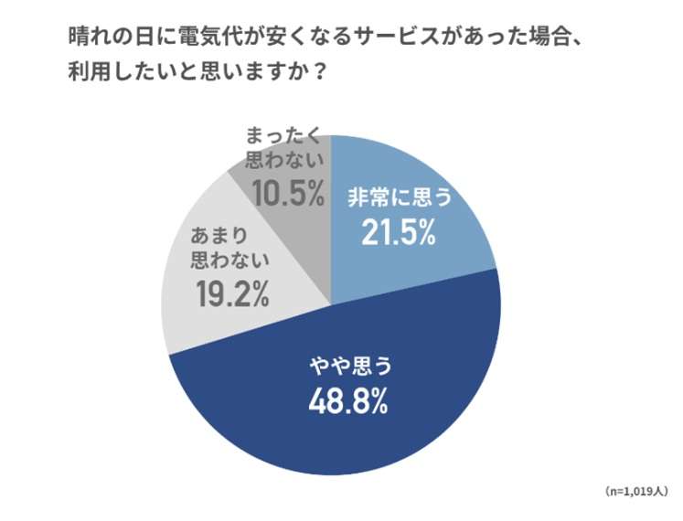 一方で「晴れの日に電気代が安くなるサービスがあれば利用したい」と回答した人は70.3%。この結果から、天気と電気代の関係性は知られていないものの、再生可能エネルギーの活用を通じた電気料金削減への期待は高いことがうかがえる。