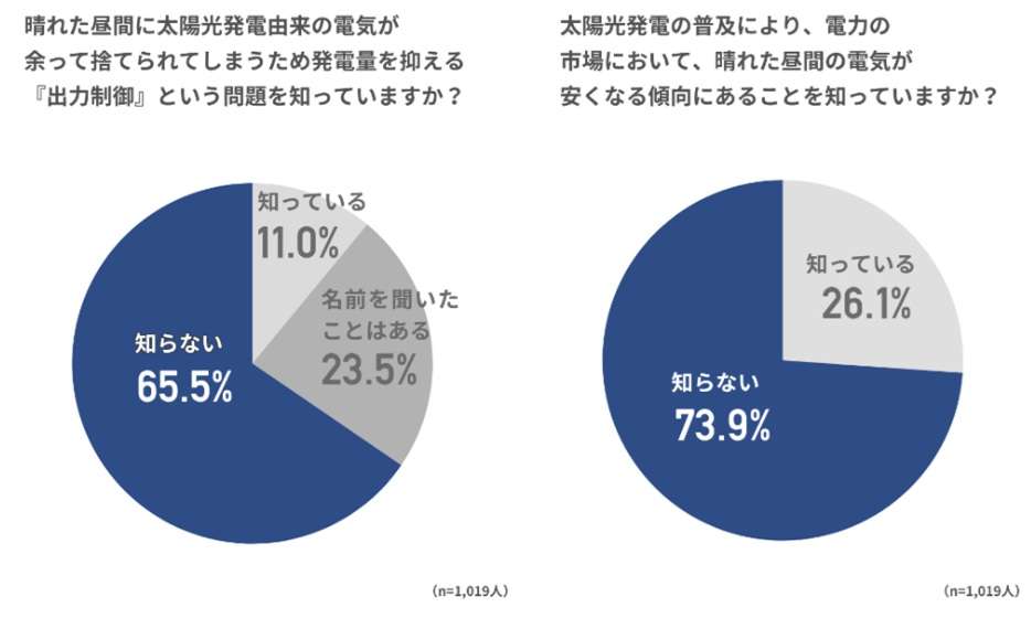 また、太陽光発電の普及に伴い発電量を抑制する「出力制御」という問題を知っている人は34.5%にとどまり、65.5%が「知らない」と回答。さらに「晴れた昼間の電気が安くなる傾向」を認識している人は26.1%にとどまり、73.9%が知らないと答えた。