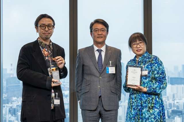 表彰式では、ケイミュー・木村社長(中央)からシーラカンスアンドアソシエイツの赤松佳珠子さんと大村真也さんに最優秀賞のトロフィーと表彰状が贈られた