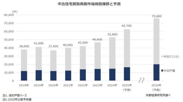 矢野経済研究所(東京都中野区)は、国内の中古住宅買取再販市場に関する調査結果を公表した。2024年の市場規模は成約戸数ベースで前年比13.3%増の5万2800戸と推計。2025年は18.8%増の6万2700戸に達する見込みを示す。