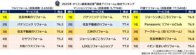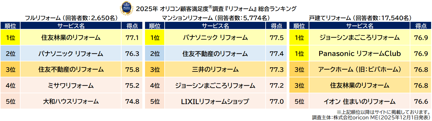 オリコン(東京都港区)は12月1日、グループ会社のoricon MEが実施した「リフォーム」顧客満足度調査の結果を「オリコン顧客満足度®」公式サイト内で公表した。複数個所に対して、計500万円以上のリフォームを行った人を対象としたフルリフォーム部門では、「住友林業のリフォーム」が3年連続で総合1位を獲得。「営業担当者の接客力」や「工程管理」、「費用」など7つの評価項目全てで首位を占めた。実際の利用者からは「親身な対応」「安心感」などを評価する声が寄せられ、こまめな対応力の高さが満足度に寄与した要因とみられる。