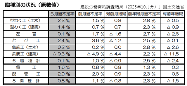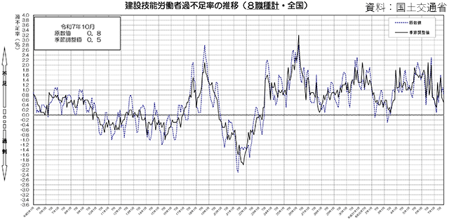 国土交通省が11月25日公表した2025年10月分の「建設労働需給調査結果」によると、8職種の過不足率は0.8%の不足となり、9月と比べて0.3ポイント不足幅が縮小した。電工・配管工を除いた6職種は0.1%の不足で、前月より0.9ポイント不足幅が縮小している。