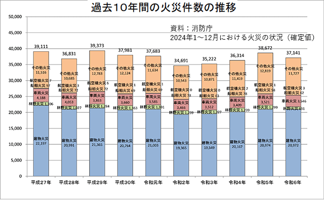 総務省消防庁が11月25日に公表した2024年(1~12月)の火災状況(PDF)によると、総出火件数は3万7141件で、前年より1531件減少した。このうち「建物火災」が2万972件で、全体の56.5%を占めている。