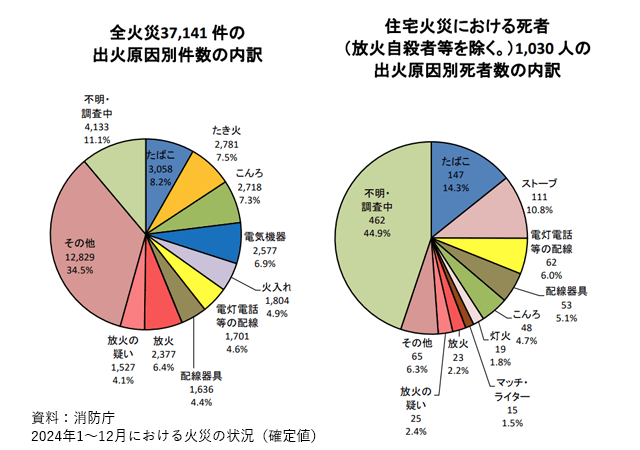 出火原因は、住宅火災では「コンロ」が最も多く1745件(14.7%)。次いで、「たばこ」1242件(10.5%)、「電気機器」965件(8.2%)、「ストーブ」812件(6.9%)、「配線器具」788件(6.7%)の順となっている。出火箇所は、住宅火災では「居室」が5517件(14.9%)で最も多かった。