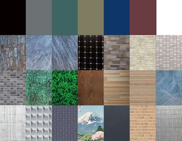 木目調、石目調、原色カラー、無機調など、建築や風景に溶け込む多彩な仕上げをラインアップ。一見すると太陽光パネルとはわからないデザイン性が特徴となっており、外壁にも対応する。