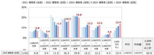 建築費の全国平均は対前年で73万円上昇。3000万円以上の割合も初めて6割を超え、2016年(2799万円)比では約25%の増加となった。土地代は平均1948万円と、前年からは383万円下落したが、中央値は1400万円と100万円の上昇。高額物件の減少による平均額の低下と、中価格帯の底上げが同時に起きている特徴的な分布の変化が見られる。