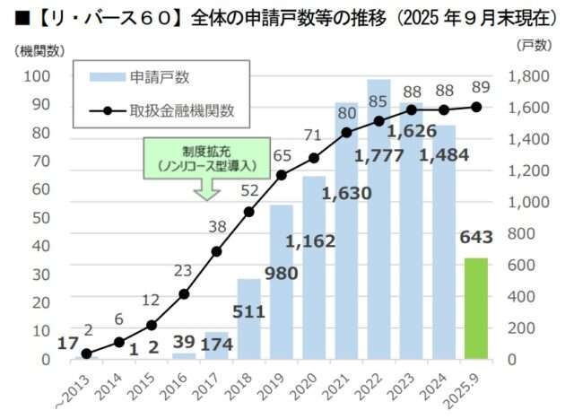 住宅金融支援機構(東京都文京区)は、満60歳以上を対象とするリバースモーゲージ型住宅ローン【リ・バース60】の2025年7~9月までの利用実績を公表した。全体の利用実績をみると申請戸数は316戸で前年同期比79.4%、実績戸数は271戸で同85.2%、実績金額は37.8億円で同75.8%となり、前年同期を下回っている。