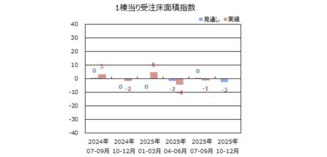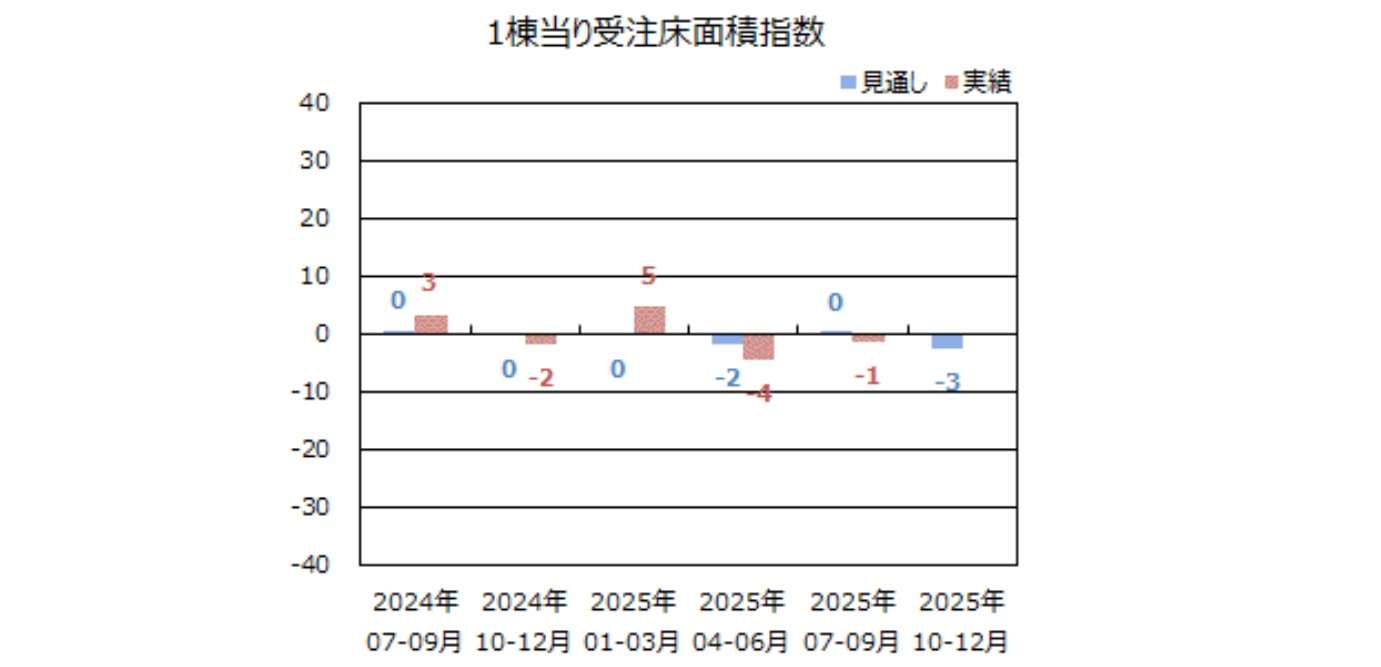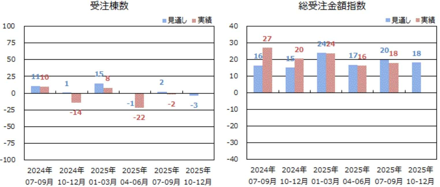 住宅生産団体連合会(住団連)はこのほど、2025年度第3回の住宅業況調査の結果を公表した。戸建て注文住宅の10~12月期の見通しは、7~9月期に比べ、受注棟数(戸数)の指数マイナス3、一棟(戸)当たりの床面積マイナス3に対し、受注金額はプラス18となる見通しだ。全国的には、受注金額が今期と比較して変わらないと見通す回答が5割弱だった。受注棟数は「上がる」、「下がる」と回答した層はともに3割弱で、5割弱が「今期と同じ」としている。