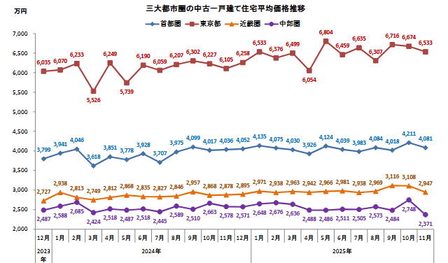 東京都は6533万円(2.1%減)と連続下落。前年同月比は築古化が進んでいるものの、価格は上回る状況が続く。神奈川県は4388万円(0.7%減)と下落に転じたが、前年同月は小幅ながら上回った。千葉県は2881万円(3.3%減)と再び下落し、前年同月比もマイナスとなった。埼玉県は2970万円(1.7%増)と築古化したものの上昇した。