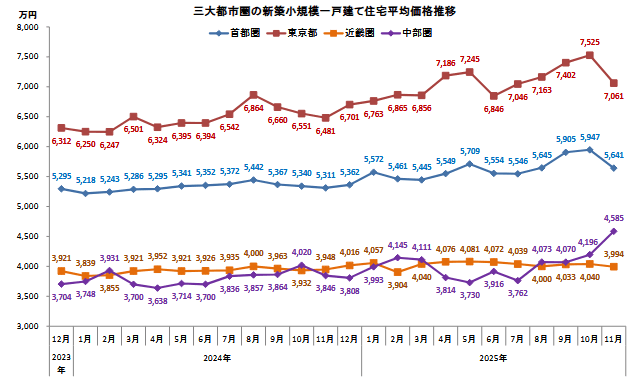 東京カンテイ(東京都品川区)が12月8日に発表した11月の首都圏における新築小規模一戸建て(土地面積50㎡以上100㎡未満)の平均価格は、前月比5.1%減の5641万円と4カ月ぶりに下落した。