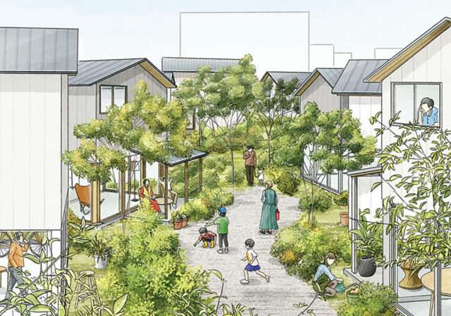 計画地は東京都西東京市柳沢。住戸ごとの庭やテラスに加え、共用の緑地や開かれた区域を設定。住宅そのものに加え、敷地の使い方やコミュニティのあり方も入居者同士で検討していく。