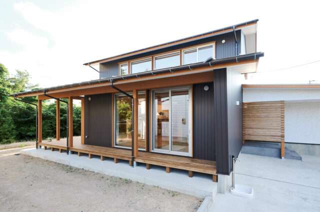 U邸の外観。1・2階に設けた樹脂サッシを囲うように霧よけと方立を配置。窓廻りの見込みを深くするとともに木質感を強めている