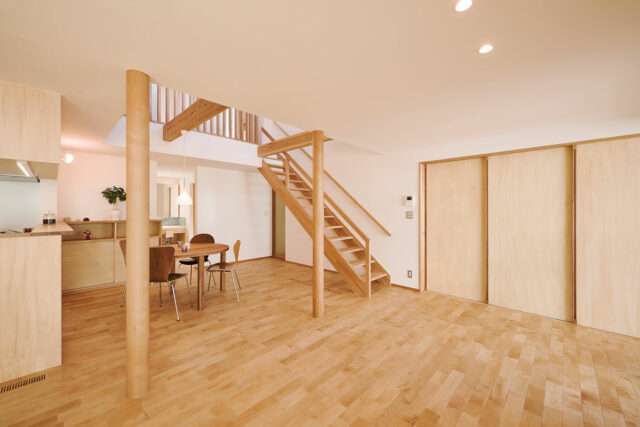 U邸のLDK。床にはバーチの無垢の縦継ぎフローリングを張っている。最近では採用率が最も高い。フローリングの幅は90㎜で厚み15㎜。節の多寡などの見た目は中程度のグレードの製品を選択。LDKにはきれいな表情のものを振り分けている