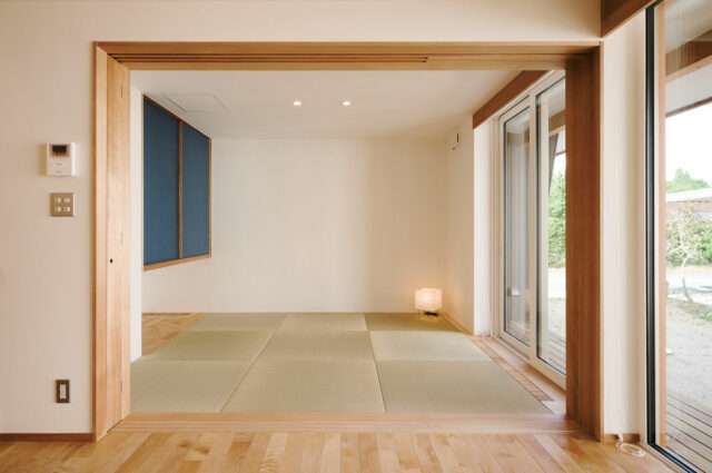 U邸の木製建具。写真左手の戸袋のなかに引き込まれる。敷居は床とフラットに納めており、引戸を開くと完全に1つの部屋になる。ほかの居室などの建具は上吊りの引戸がほとんど