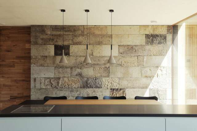 A. 自邸のダイニングで壁に積んだのは、地元産の凝灰岩の院内石。かつては塀などに多用された。現在は採掘されていないため廃材を再利用。風化した表面を生かした