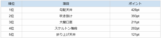 3位は大開口窓だ。壁一面を占める大型窓で、外の景色を大胆に取り込み、室内を明るく開放的に見せる。「窓面積を大きくすることで景色が広く見え、空間が広くなる」といった意見が挙がった。以下、4位がスケルトン階段、5位が折り上げ天井となっている。