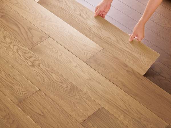 天然木突板を採用し、薄過ぎず下地不陸があらわれにくい3.9mm厚。既存床を剥がさずに直接施工が可能で、既存の床暖房がそのまま使えるのは業界初という。