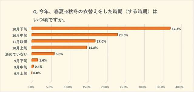 衣替えの時期や方法が変化したと回答したのは全体の71.2%。これまでは10月上旬~中旬が衣替えの時期だったが、2025年は10月下旬(37.2%)が最多で、数週間ほど時期が後ろ倒しになった。