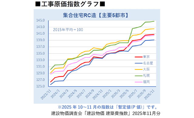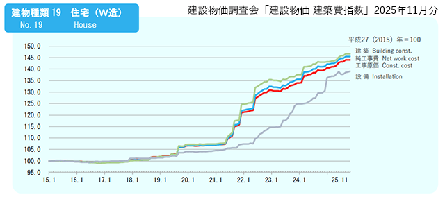 建設物価調査会が12月10日公表した2025年11月分の「建設物価建築費指数」(暫定値)によると、工事原価で見た木造住宅の建築費指数は144.0となり、前月から横ばいで推移した。前年同月比では3.3%(4.6ポイント)の増加となっている。