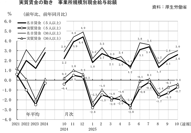 全産業平均は、現金給与総額が30万141円(同2.6%増)となり、46カ月連続でプラスとなっている。実質賃金指数(※)は同0.7%減の82.0で、10カ月連続でマイナスとなった。