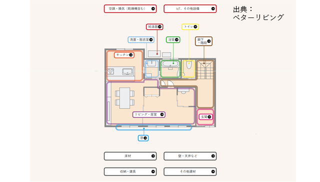 リニューアル後のメニューでは、キッチン・浴室・トイレ・リビングなどの部屋タイプに加えて、「空調・換気(乾燥機含む)」「IoT、その他設備」「床材」「壁・天井など」「収納・建具」「その他建材」などの項目を新設している。