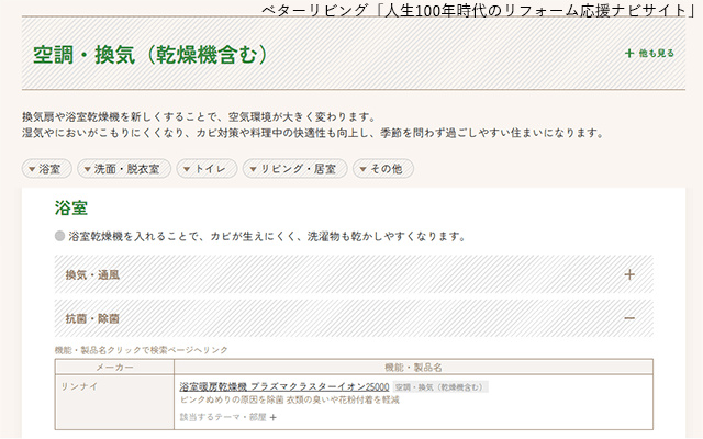 例えば、メニューの中から「空調・換気(乾燥機含む)」を選んだ場合、「浴室」「洗面・脱衣室」「トイレ」「リビング・居室」「その他」といった空調・換気設備が使われるすべての部屋タイプが表示され、その中からユーザーが求める効果が得られる設備が検索できる。求める効果については、「換気・通風」「抗菌・除菌」「遠隔操作・確認・通知」「家事ラク」などの中から選べ、推奨製品の一覧(リンク付き)が閲覧できる。