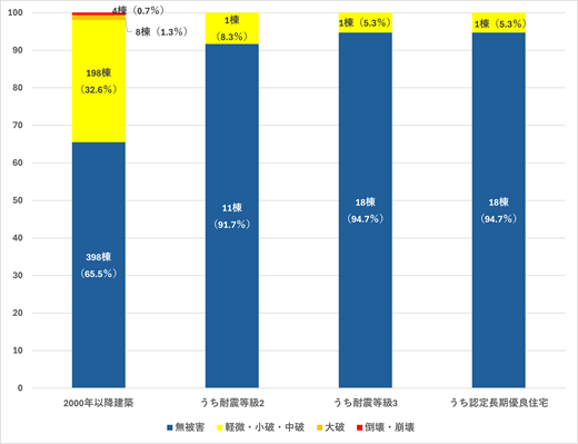 木造建築物の被害については、日本建築学会が石川県輪島市、珠洲市、穴水町で実施した悉皆(しっかい)調査の結果から分析した。2000年以降に建築された住宅608棟のうち、398棟(65.5%)は無被害だったが4棟が倒壊、8棟が大破。軽微な被害なども含めると3割以上が被害を受けた。