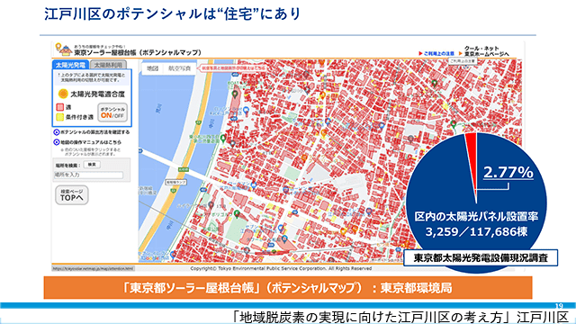江戸川区は脱炭素化を強力に推進する理由として、区内の陸域の7割が海抜0メートル地帯にあり、気候変動の影響、中でも水害を受けやすい地域特性があることを挙げた。また、気候変動の要因となるCO2排出量のうち約4割を家庭部門が占めるといった背景もある。そのため住宅の脱炭素化が「カーボンマイナスの実現」の鍵を握ると位置付けている。