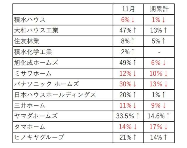 一方、減少した5社のうち、ミサワホームは11カ月、パナソニックホームズは12カ月連続の減少。タマホームも5カ月連続の2ケタ減となり、明暗が分かれた。