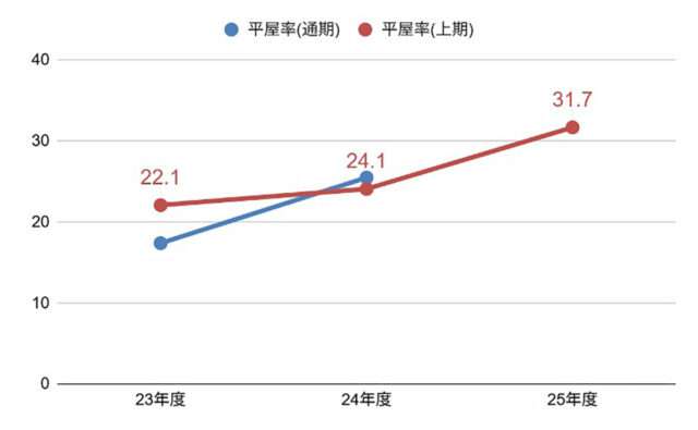 アリエッタは従来、主に2階建て商品として提案を行ってきた。平屋率も10%台だったが、22年度は22.1%、24年度は24.1%まで上昇。同社は、価格高騰や生活様式の変化、高齢化社会の進展などを踏まえつつ「郊外や地方でのゆとりある暮らしへの志向が高まったこと、さらに効率的で快適な住空間を求めるニーズ」に、アリエッタHIRAYAが合致した結果との見解を示している。