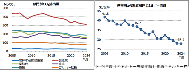 部門別CO2排出量(左)と世帯当たりのエネルギー消費