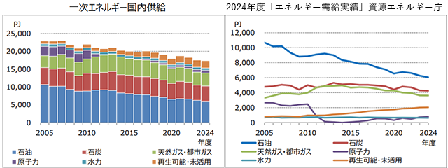 一次エネルギー国内供給は、前年度比で1.1%の減少。このうち石油・石炭、天然ガス・都市ガスなどの化石燃料は1.9%減少した。非化石燃料は2.2%増となっている。非化石燃料の内訳は、発電プラントが新たに2基再稼働した「原子力」が9.6%増と大きく伸び、水力を除く「再生可能エネルギー」も1.2%増加している。